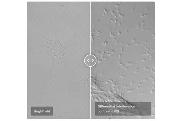 Unstained biological specimens often do not show a very high contrast. Thick specimens in particular, such as brain slices, show up as nothing more than light grey structures instead of single cells.