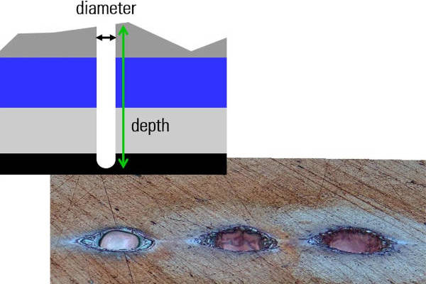 Schematic of µ-drilled hole with diameter and depth indicated – Copper alloy with µ-drilled holes via LIBS