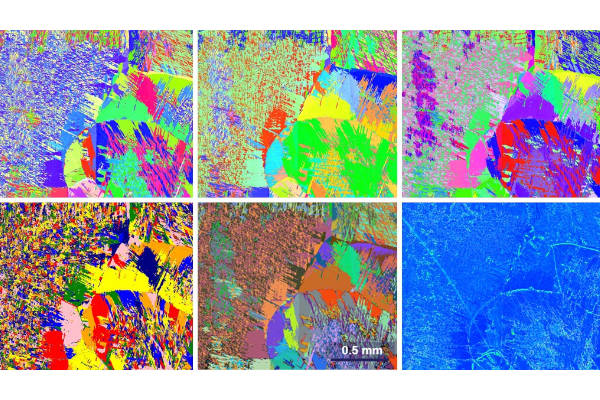 Deformed high-entropy alloy analyzed with the TruePix Detector. Top line IPF (X,Y,Z) orientation maps, bottom line: Grains, Euler and Kernel-average misorientation strain map.