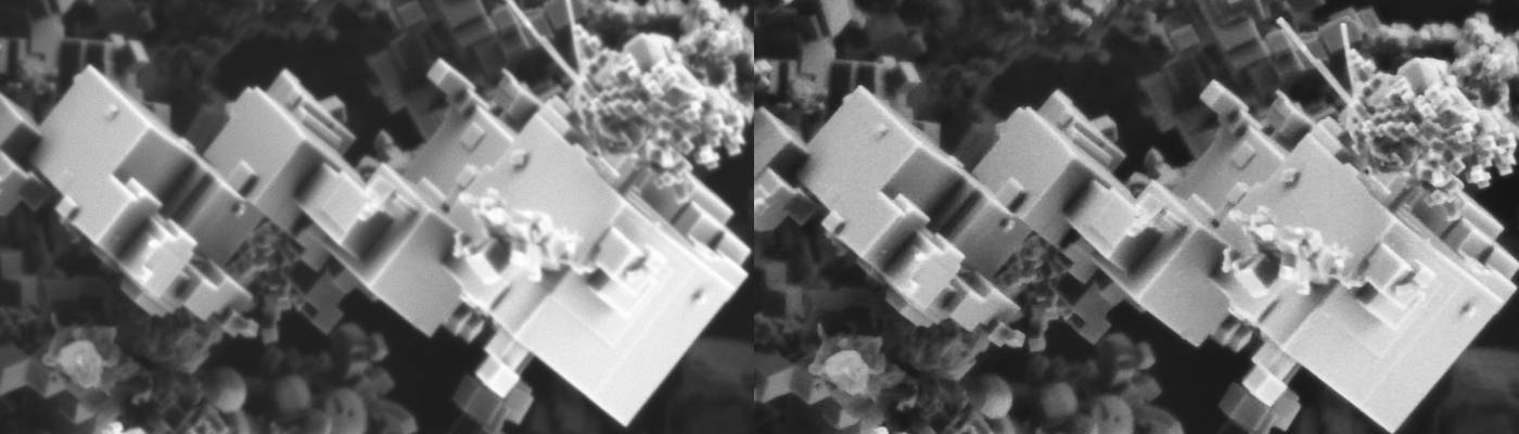 Left: Image acquired without SFI shows elongated magnesium oxide particles.
