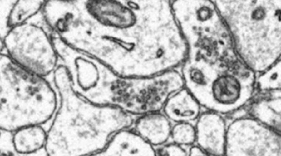 Mouse brain sample imaged on the Volumescope 2 SEM. Fine features such as vesicles and synaptic clefts can be observed. Image courtesy of Dr. Gabor Nyiri, Institute of Experimental Medicine, Budapest, Hungary.