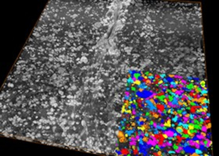 Serial block-face 3D imaging of a polymer blend sample. Here, the 3D volume reconstruction of the complete dataset (122 μm x 122 μm x 10 μm) is shown, with a segmented region inset revealing the particle distribution in the matrix. Sample courtesy of Dr. Armin Zankel (FELMI-ZFE Graz, Austria).